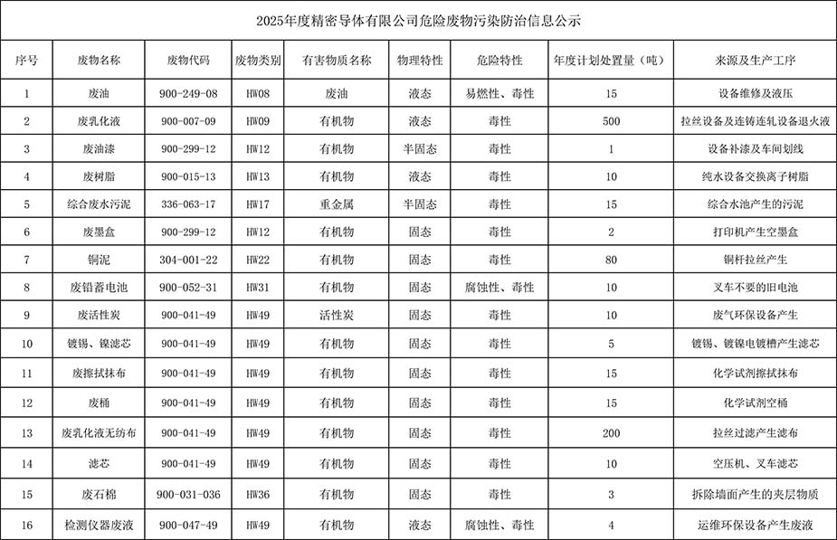 2025年度精密導體危險廢物污染防治信息公示