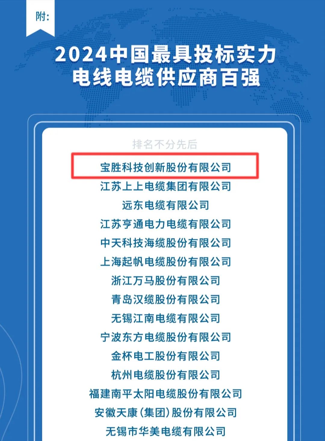 近日,由招投標(biāo)品牌調(diào)研公示服務(wù)平臺(tái)舉辦的“2024年度中國電線電纜招標(biāo)采購評(píng)價(jià)推介暨遴選優(yōu)秀誠信供應(yīng)商活動(dòng)”圓滿結(jié)束,其中備受關(guān)注的“2024中國最具投標(biāo)實(shí)力電線電纜供應(yīng)商百強(qiáng)”榜單發(fā)布,寶勝科技創(chuàng)新股份有限公司榮耀登榜。